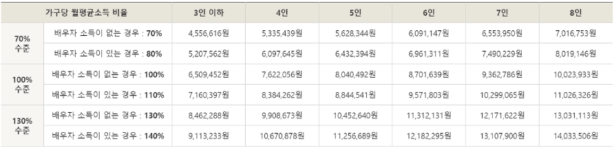 - 총소득이 전년도 가구당 도시근로자 월평균 소득 130%이하인 경우(배우자 소득 있을 시 140%이하)