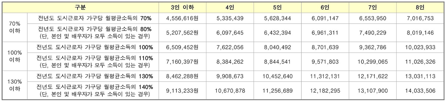 전년도 도시근로자 가구당 월평균소득의 130%(외벌이)