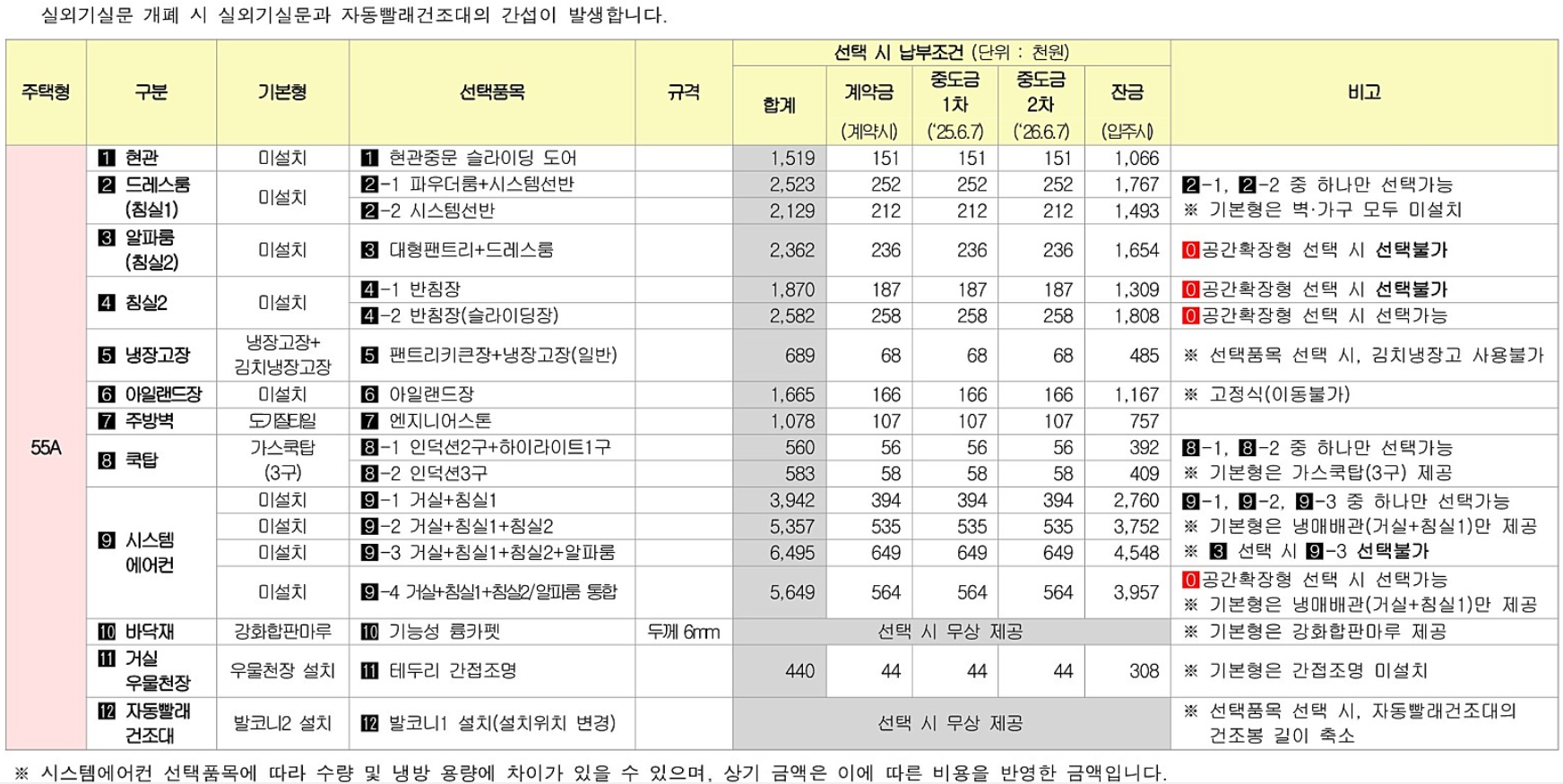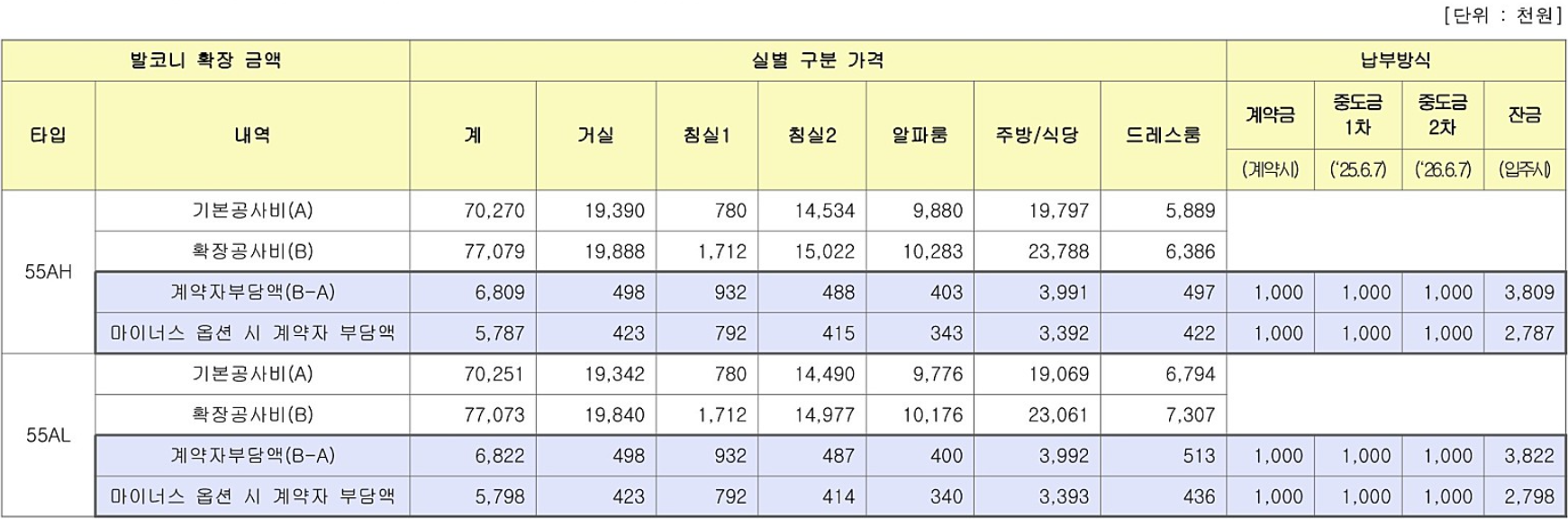 마이너스 옵션과 기본옵션을 기준으로 아래와 같이 가격이 나왔습니다. 발코니 확장비용은 별도입니다. 착오 없으시길 바랍니다.
