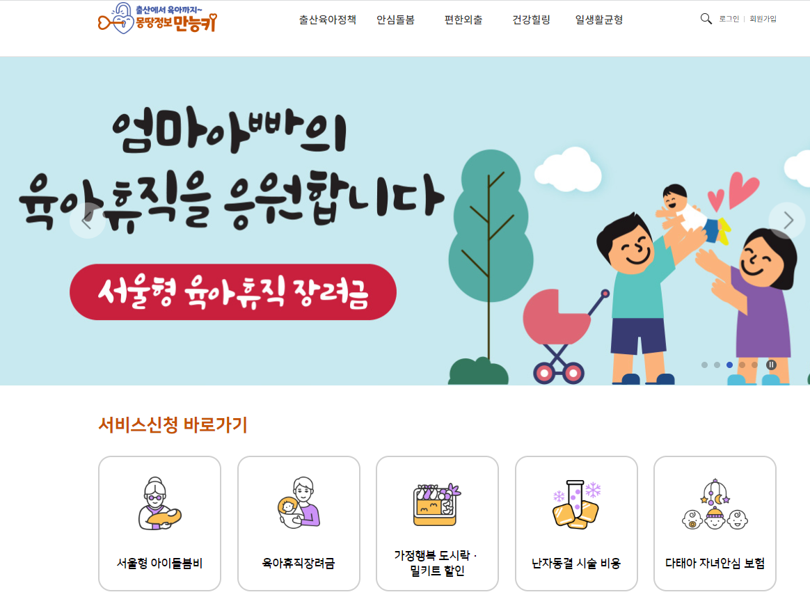 대상으로는 24개월 ~ 36개월 이하 영아를 키우는 중위소득자(150%이하)의 양육공백 가정이라면 몽땅정보 만능키 사이트를 통하여 온라인 신청을 할 수 있다. https://umppa.seoul.go.kr/