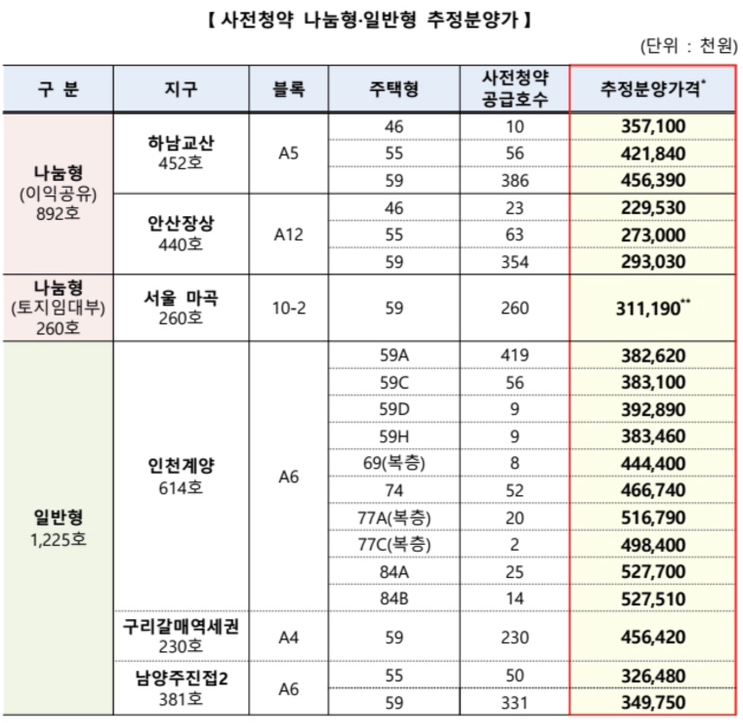 이번 사전청약은 나눔형으로 서울 마곡 10-2랑 하남 교산지구에서 1,152호, 일반형으로는 인천계약 및 구리갈매역세권에서 1,225호가 공급됩니다. 그리고 사전청약으로는 처음으로 공급되는 선택형은 남양주진접2, 군포대야미, 구리갈매역세권에서 918호 공급됩니다. 제일 중요한 추정 분양가 아래 정리했습니다.