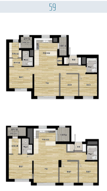 하남교산지구와 안산장상지구의 타입별 평형별 예시 평면을 아래 정리해 놓았습니다. 타입으로는 전용면적으로 46, 55, 59 3가지가 있습니다.