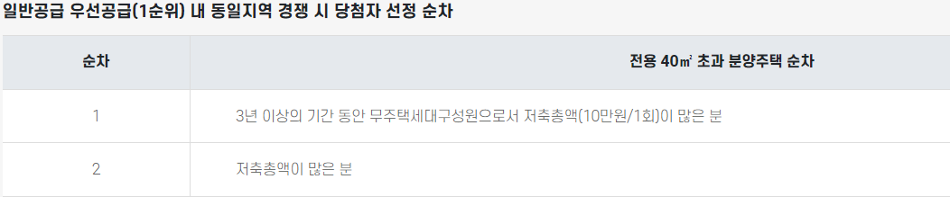 일반공급으로 나온 매물의 80%는 입주자 청약저축 1순위자에 공급합니다. 경쟁시에는 아래의 표에 따라서 선정되며, 동점시에는 추첨으로 선정합니다.