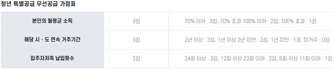 청년 특별공급 총 매물의 70%의 매물을 공급합니다. (청년 특별공급에서 낙첨하신 분들은 잔여공급에 한번더 지원이 됩니다.) 이 또한 경쟁이 발생하면 아래의 가점표에 따라서 다득점순으로 선정이 됩니다. 동점자는 추첨으로 선정하게 됩니다.