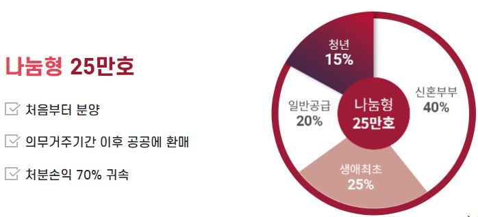 나눔형은 주변 시세대비 70% 이하로 분양을 하는 대신에 의무거주기간 5년 이후 주택을 공공에 환매 할 수 있습니다. 환매시 처분손익은 70%입니다. 예를들어 환매순익으로 1억을 이득보면 7천만원만 가져가실 수 있습니다. 반대로 1억을 손해보더라도 7천만원만 손해보신다고 생각하시면 됩니다.