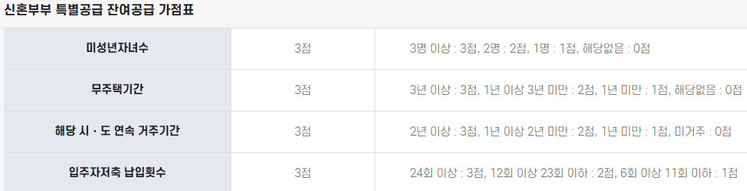 신혼부부 특별공급으로 나온 총 매물중에서 30%는 혼인기간 2년 이내이거나(예비신혼부부포함) 2세 이하의 자녀를 둔 신혼부부 및 2세 이하 자녀를 둔 한부모가족에 우선 공급합니다. 경쟁시에는 아래의 가점표에 따라서 선정되며, 동점시에는 추첨으로 선정합니다.