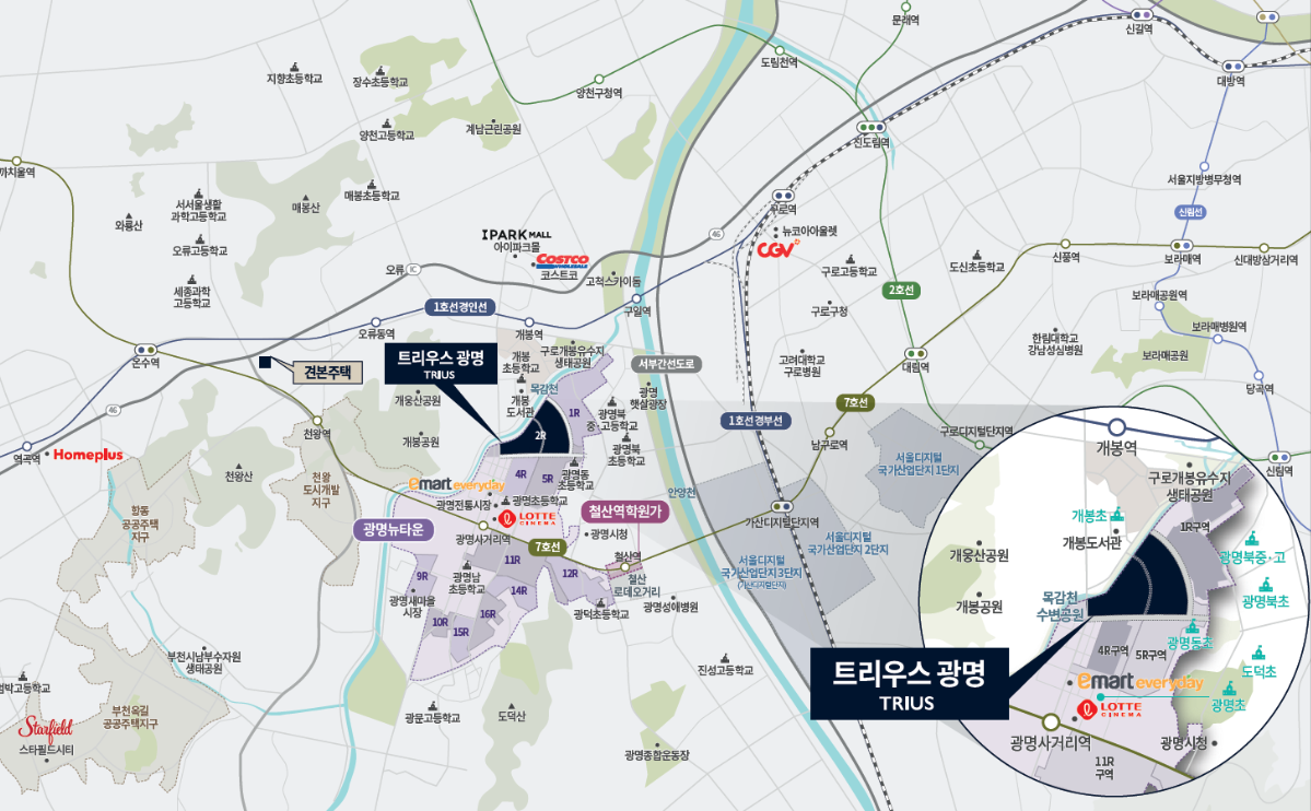 광명 트리우스는 7호선 광명사거리역에서 가깝습니다. 아래의 입지를 보시면 아파트 주면으로 모든 인프라가 잘 구비되어 있습니다. 이마트, 롯데시네마, 목감천수변공원 등등 너무 습니다.
