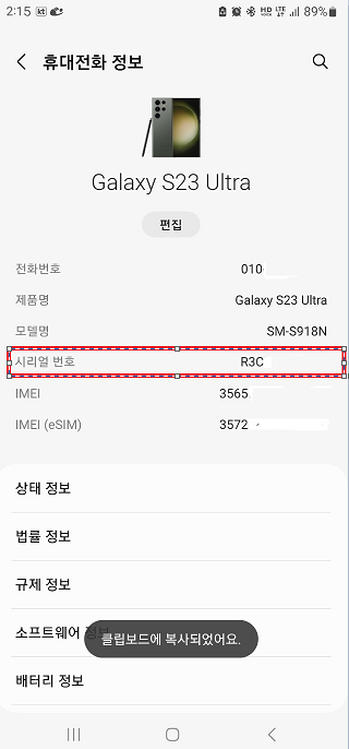 • 휴대폰의 시리얼번호를 복사합니다. (시리얼번호를 누르고 계시면 클립보드에 복사되었어요. 라고 나오면서 복사고 됩니다.)